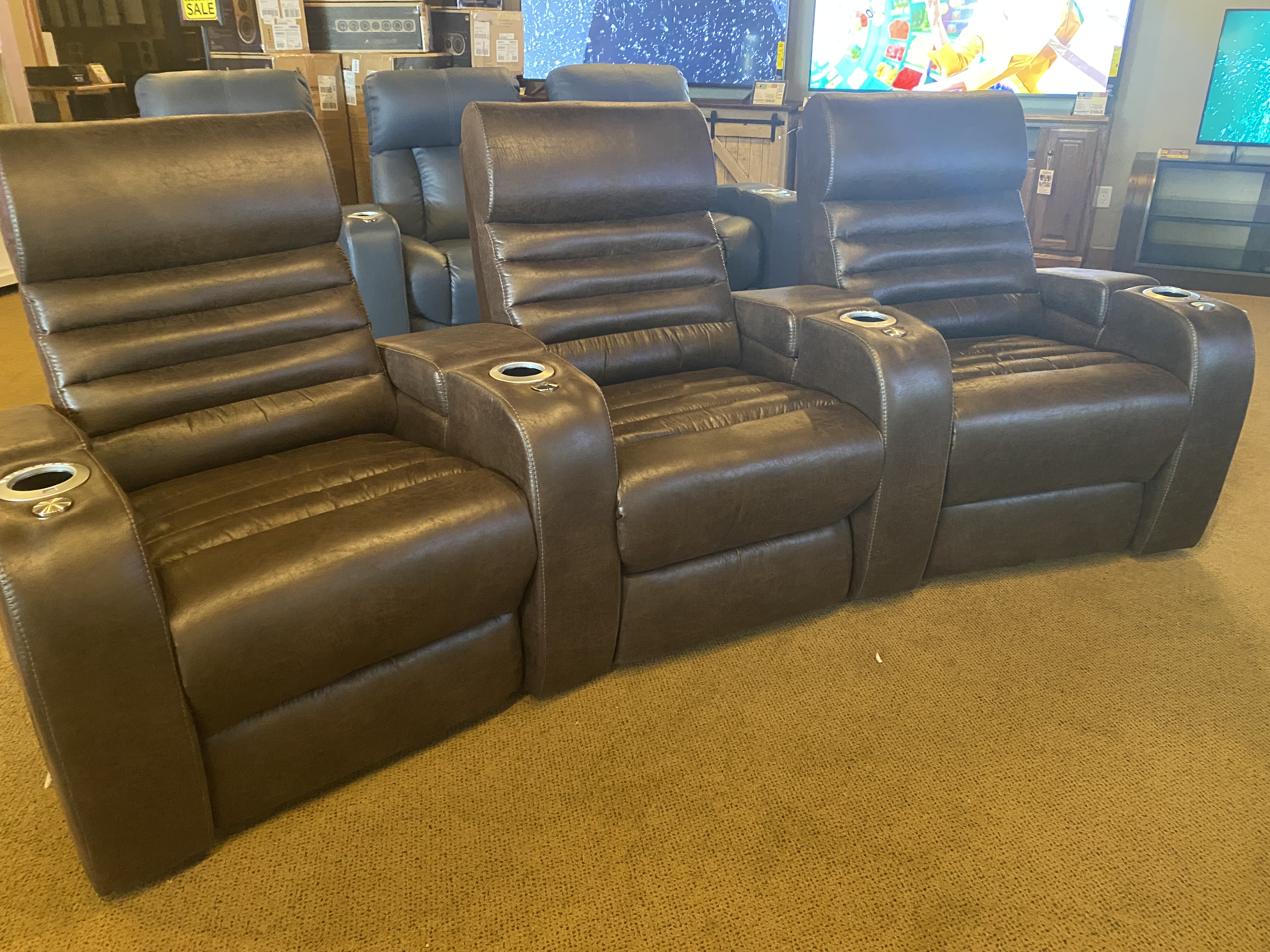 The luxurious Catalina is the ultimate spot for enjoying your favourite media. Modern channelled detailing boasting 1.5" of memory foam in each channel will conform to your body and cradle every contour as you melt into your seat. Full pad-over chaise with extended footrest leaves no part of your leg unsupported, with a welcome bit of extra room for taller occupants. At the push of a button, power lumbar, headrest, and recline will smoothly move to your favourite viewing position, which can be saved and returned to over and over with the memory key function. All functions, including LED lighting in the cupholder with seven different colour choices and three intensities, are conveniently controlled from the cupholder. An integrated smart USB port keeps devices charged. Extra storage can be found in the wide arms, with optional grommets to add on a table, tablet holder, wineglass holder, or flex light. With sleek contemporary styling and the best in modern functionality, the Catalina will soon become the most coveted seat in your home theatre.Read More