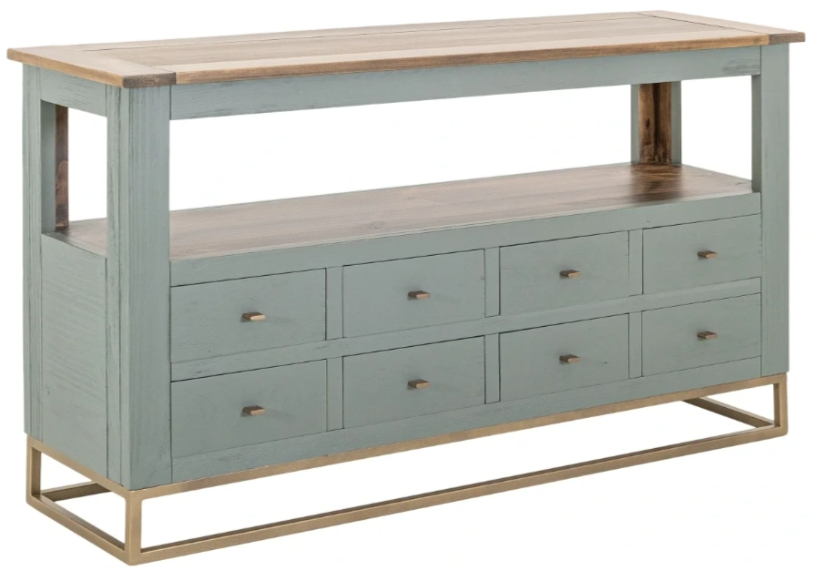 They are accented by a hand-rubbed brown top that enhances the wood's natural beauty. The Sofa table has eight drawers that glide smoothly on wood-on-wood slides and an open shelf below it. It is perfect for displaying décor or storing essentials, offering ample space for your essentials. Supported by a sleek gold metal base, the Timber Occasional Tables are an elegant and functional addition to any space.